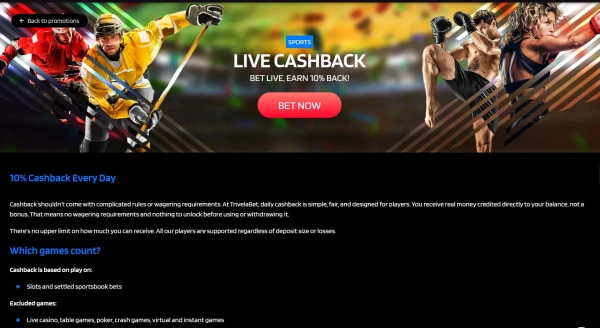 Trivelabet draait twee afzonderlijke 10% dagelijkse cashbackpromoties — één voor casinospelers en één voor live sportwedders. Beide worden automatisch als echt geld direct aan je saldo toegevoegd, niet als bonus, wat betekent dat er geen inzetvereisten zijn en niets vrijgespeeld hoeft te worden vóór uitbetaling. Er is geen bovengrens aan hoeveel cashback je kunt ontvangen, en alle actieve spelers bij TrivelabetCasino worden ondersteund, ongeacht stortingsgrootte of verlies.
