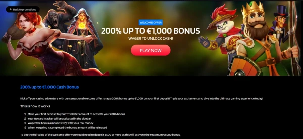 De belangrijkste casino-registratiedeal van Trivelabet voor Nederland is een 200% matchbonus tot €1.000. Om in aanmerking te komen, heb je een minimale storting van €20 in EUR nodig. De inzetvereiste is 30x het bonusbedrag, wat belangrijk is om mee te nemen bij het plannen van je sessies. We tonen de actuele aanbieding in je account, zodat je kunt bevestigen wat actief is voordat je ervoor gaat.